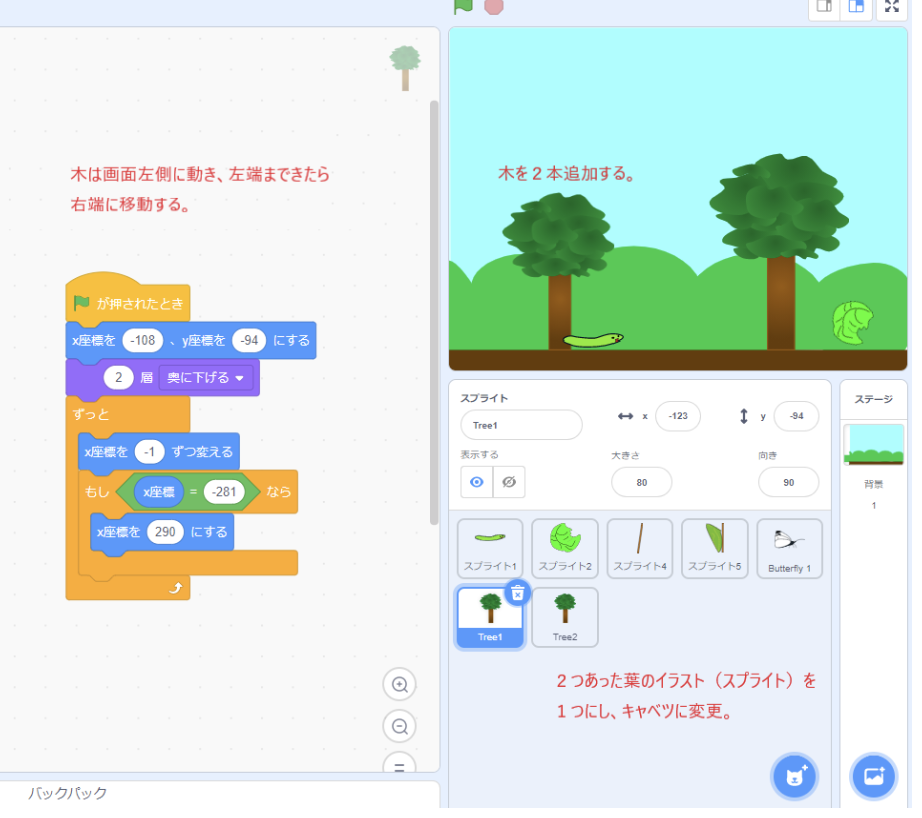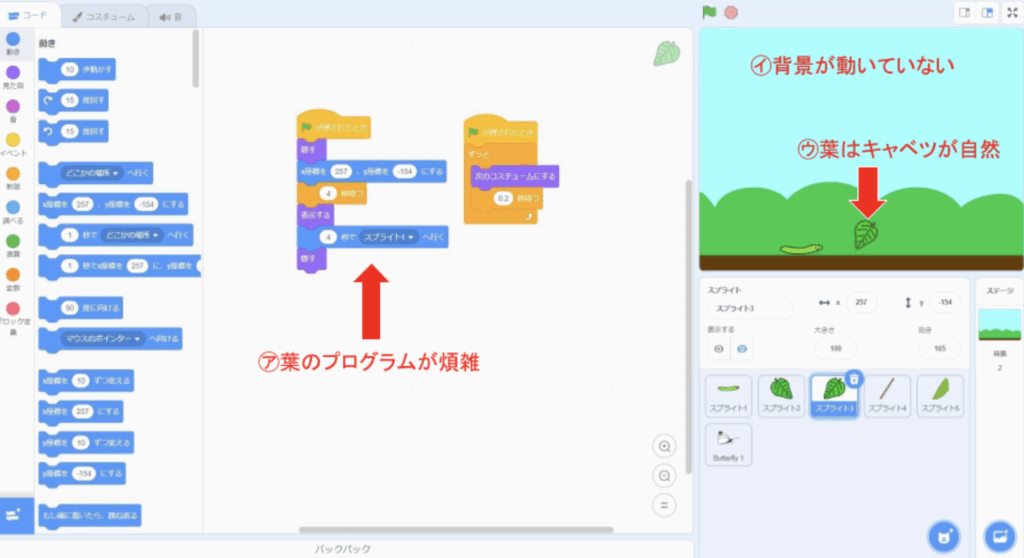 →前回のものは、葉のイラスト(スプライト)が2個、それぞれプログラムがされていたので、イラストを1個にし「あおむしに触れたとき画面の端にもどる」プログラムにした。