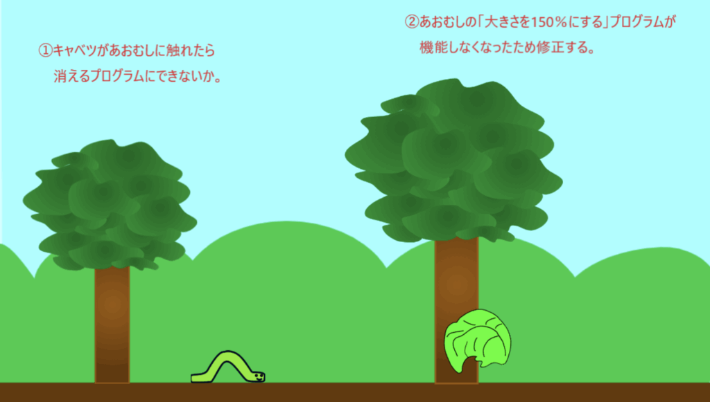 - キャベツのイラストを1つにしたことによって「大きさを150%にする」プログラムが機能しなくなったため修正する。