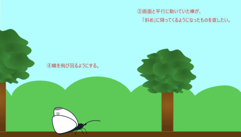- 画面と平行に動いていた棒が、他を修正したことで「斜め」に降ってくるように なったものを直したい。