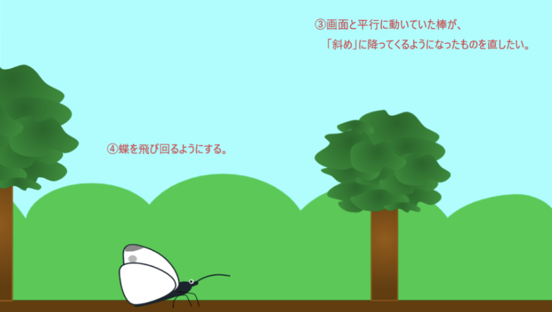 ③ 画面と平行に動いていた棒が、他を修正したことで「斜め」に降ってくるようになったものを直したい。