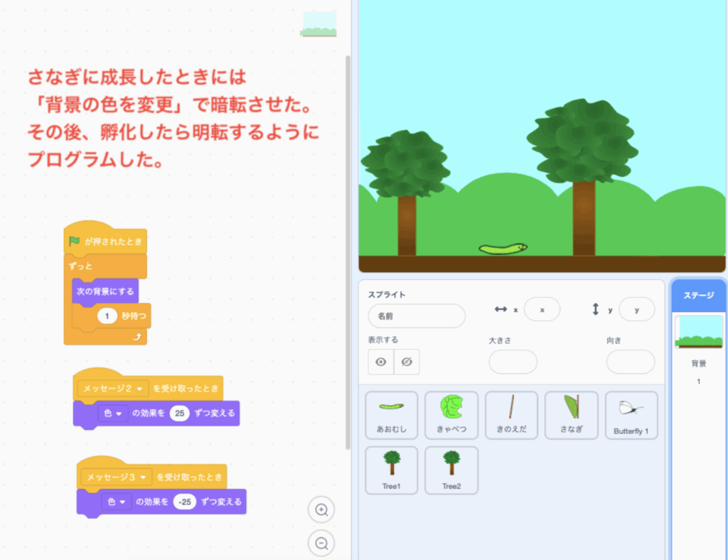 →「葉があおむしに触れたなら」という条件を追加したことで1回目は消えた。本来は2回触れたら消えるようにしたかったが、できなかったので最終的に時間にした。