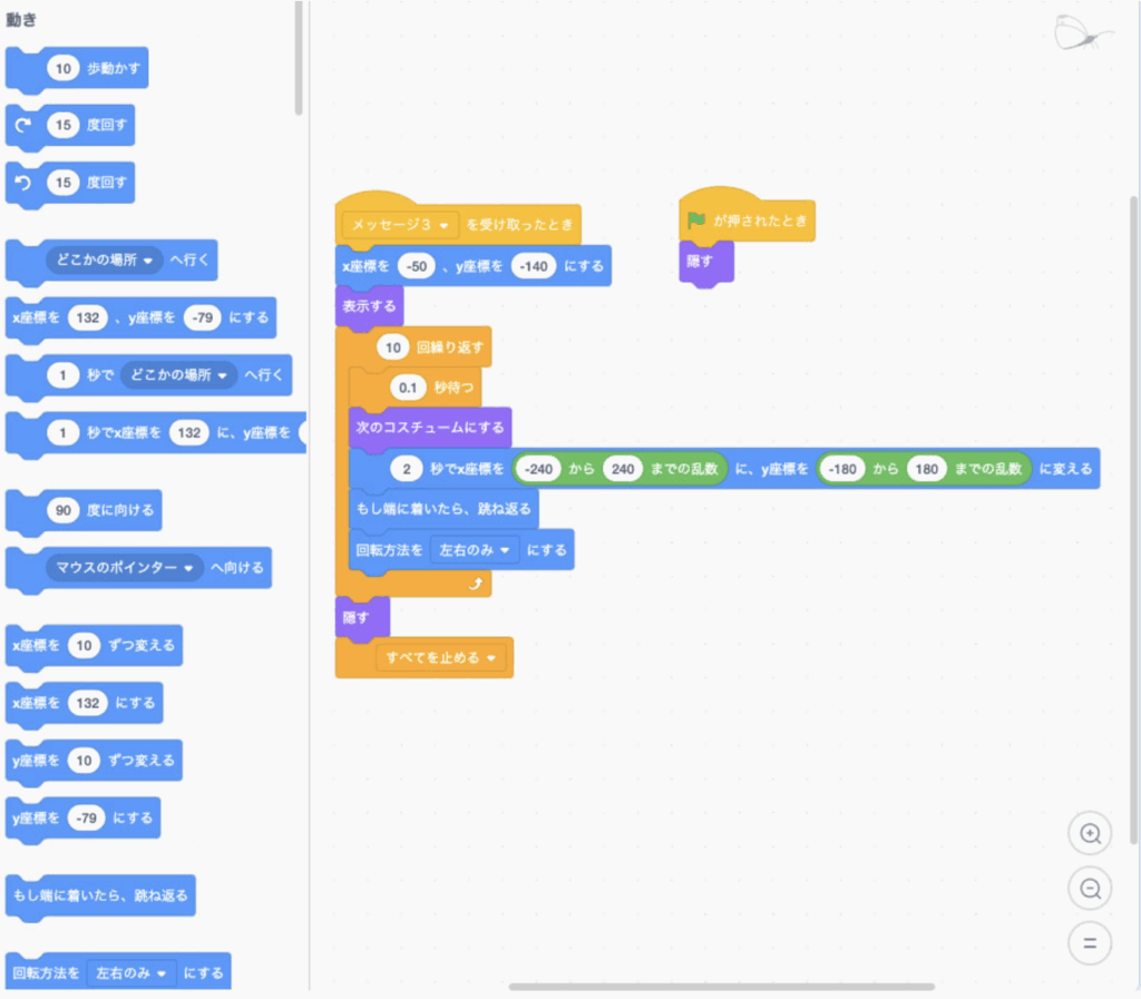 →Scratch上にたくさんの作品がアップされているので、何か飛び回っている作品を検索しては「中を見る」を繰り返しプログラムを組んだ。