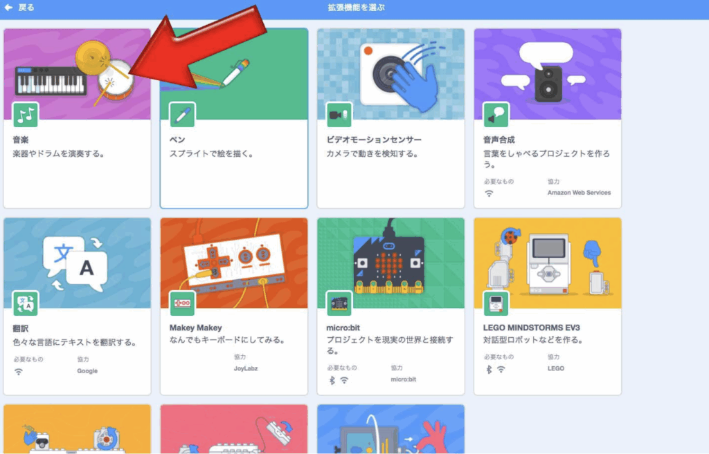 音楽は、「拡張機能」から「音楽」を選択すると、コードに追加されます。