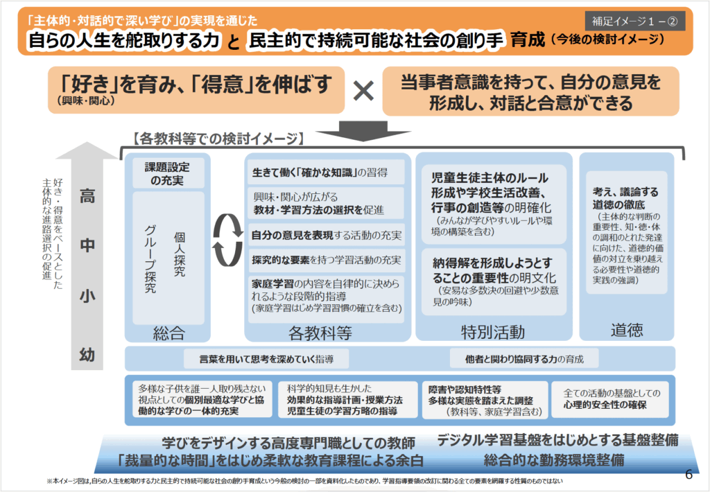そのために,一人一人の「好き」(興味・関心)を育み,「得意」を伸ばしながら学び全体への動機づけを図ること,また,当事者意識を持って,自分の意見を形成し,多様な他者との対話や合意を図ることを同時に進める必要があるとの認識が記されています。